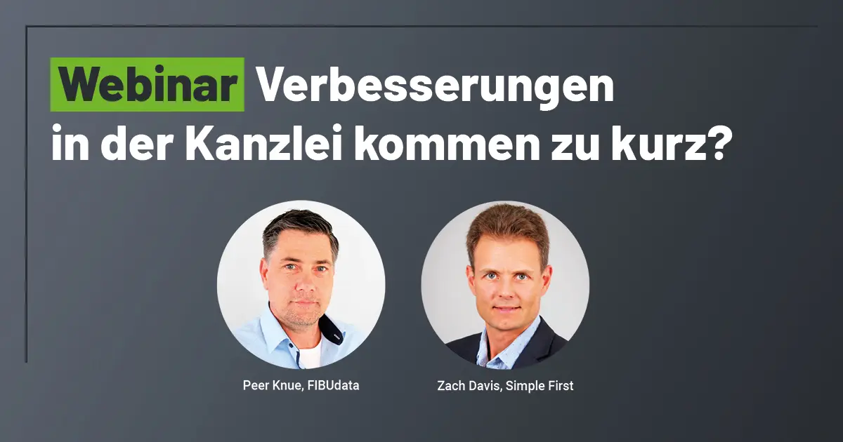 Im anspruchsvollen Kanzleialltag bleibt oft kaum Raum, um sich gezielt mit Weiterentwicklung zu befassen. In unserem gemeinsamen kostenfreien Webinar mit Zach Davis von Simple First zum Thema „Verbesserungen in der Kanzlei“ zeigen erfahrene Branchenexperten, wie sich Verbesserungen praxisnah, zielgerichtet und nachhaltig in den Arbeitsalltag integrieren lassen.